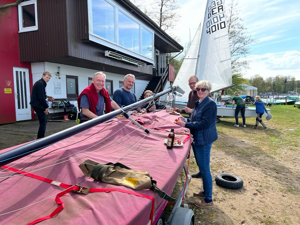 Pünktlich zum 01. Mai wurde angesegelt und die erste Yardstick für dieses Jahr bestritten. Mit der Flaggenparade wurden Flaggen und Stander für die kommende Segelsaison gesetzt. 12 Teilnehmer:innen machten sich auf, um mit ihren Lasern, Taifun und OK-Jollen die häufig drehenden südlichen Winde von 0 bis 2 Windstärken zu bestreiten. Andreas Steimann erreichte im Taifun zwar als erster das Ziel, aber durch den Yardstick-Wert der OK konnte sich Jörg Sylvester für die erste Yardstick dieses Jahr doppelte Punkte sichern. Die Ergebnisse der 1. Yardstick findet ihr hier. Anschließend wurde gemeinsam Kaffee und Kuchen bei wohligen 16°C und Sonne genossen. Die nächste Yardstick findet am 09.05.2023 um 18:30 Uhr statt, bei der jeder gegen jeden antreten kann. Vielen Dank an alle Mitglieder für die leckeren Kuchenspenden.