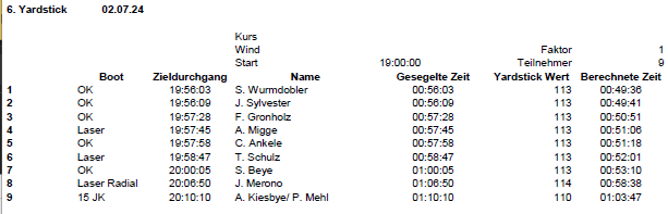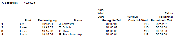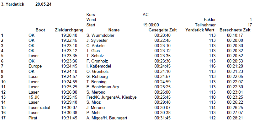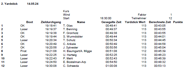 | 18.06.2024/27.08.2024 | 5. Wettfahrt, Start ca. 18:30 Uhr | jeweils ausgefallen mangels Wind |
