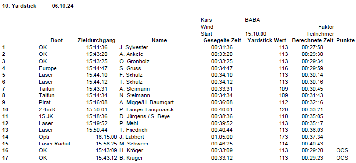 | 24.09.2024 | 9. Wettfahrt, Start ca. 18:30 Uhr | ausgefallen mangels Wind |
