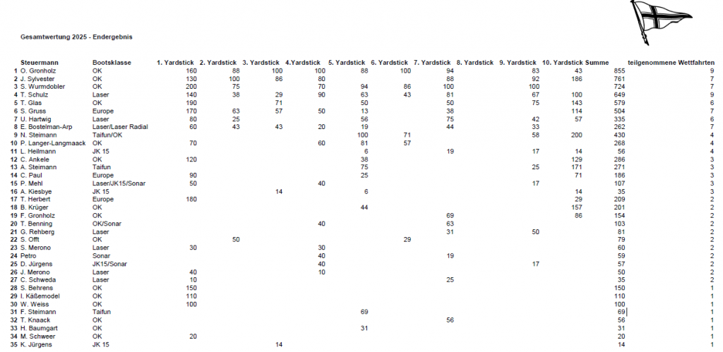 Die Gesamtwertung setzt sich am Ende aus allen ersegelten Punkten über alle 10 Wettfahrten hinweg